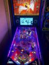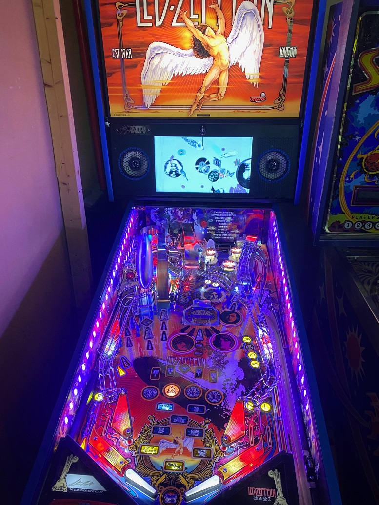 three flippers, rising magnet spinner mech, expression lights, four ramps, shaker motor, HD glass, mirrored backglass, 10 rockin' Zep tunes |