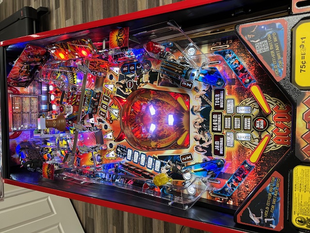 It's the thunder from down under, one of the greatest hard rock bands in history, AC/DC! And thanks to Stern, in 2012, they got their very own completely awesome, loud, and rockin' pinball machine!!! This game from legendary designer Steve Ritchie has it all; a player controlled cannon, underneath "Hell" playfield, moving TNT plunger, lighted 3D Rock n Roll Train sculpt ramps, multiballs, two drop target banks, and a soundtrack of a dozen of AC/DC's best tunes. You'll be duck-walking all over your game room and bobbing your head manically, as you hit the molded playfield sculpt swinging Bell for playfield multipliers, and try to juice it up for HUGE song jackpot scores! This game just screams rock 'n roll, with shots punctuated by tolling bells, heavy riffs, and searing guitar licks. It may be the best rock pinball game of them all. A game that is already legendary among pinballers, it's AC/DC by Stern. Take a trip to the Highway to Hell and you'll see that Hell Ain't a Bad Place to be when it's accompanied by Angus, Brian, Malcom, and the rest of the crew. An all-time banger of a game!!! This game is home use only, in Mint condition, and came to us with only 500 lifetime plays! |