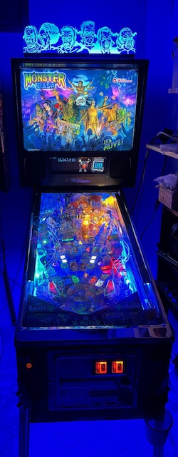 This is one for the collector of truly exquisite and rare high end pinball machines: a genuine, original, completely restored Williams Monster Bash pinball machine. This game is in mint condition, with a brand new playfield and restored cabinet, chrome coin door, legs, and rails, hand-painted sculpts, along with countless awesome mods including a laseriffic topper, undercab lighting, and top of the line pinstadium light show. One of the nicest original examples on the planet of one of the greatest pinball machines ever made, this magnificent machine holds a trophy value - as well as original gameplay quality - that a modern "remake" will never have. This game is simply gorgeous in every way, and it's been tweaked and dialed in to play as Williams' designers intended. More photos available upon request. The game itself is legendary for its humor, clever theme integration, and amazing sound, speech and music. This machine will truly be the centerpiece of even the most magnificently curated pinball collections, and now that the inferior remakes are no longer available, its value will only rise. Plenty of other pictures available upon request. |